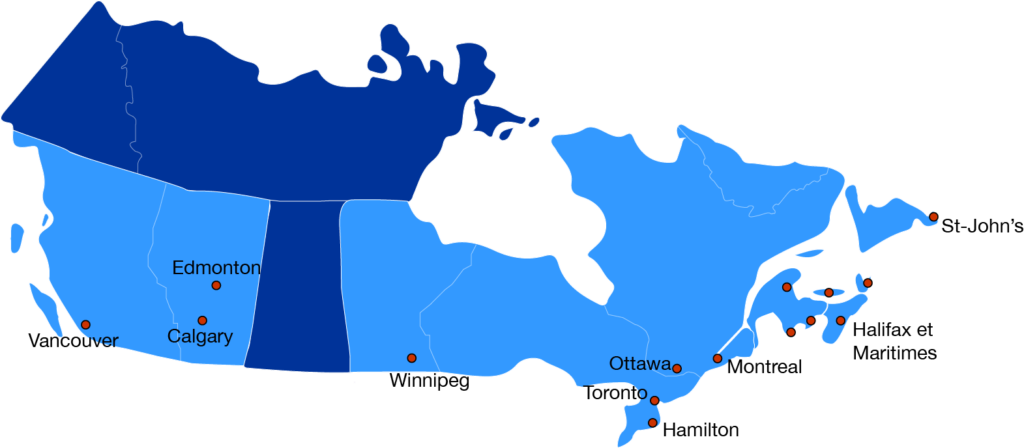 カナダ国内ではカナダ有数の大都市であるトロントやモントリオールへのアクセスが良好です。地図を見ると、3つの都市が隣接していることがわかります。オタワに来れば、カナダのメイン都市3つを一度に楽しむことが可能ですよ!